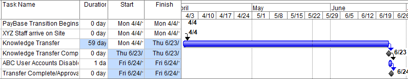 The following GANTT chart illustrates the schedule for transition of the PayBase contract from ABC Corp. to XYZ Inc. Any changes to this schedule will require review and approval from the customer and all other parties.